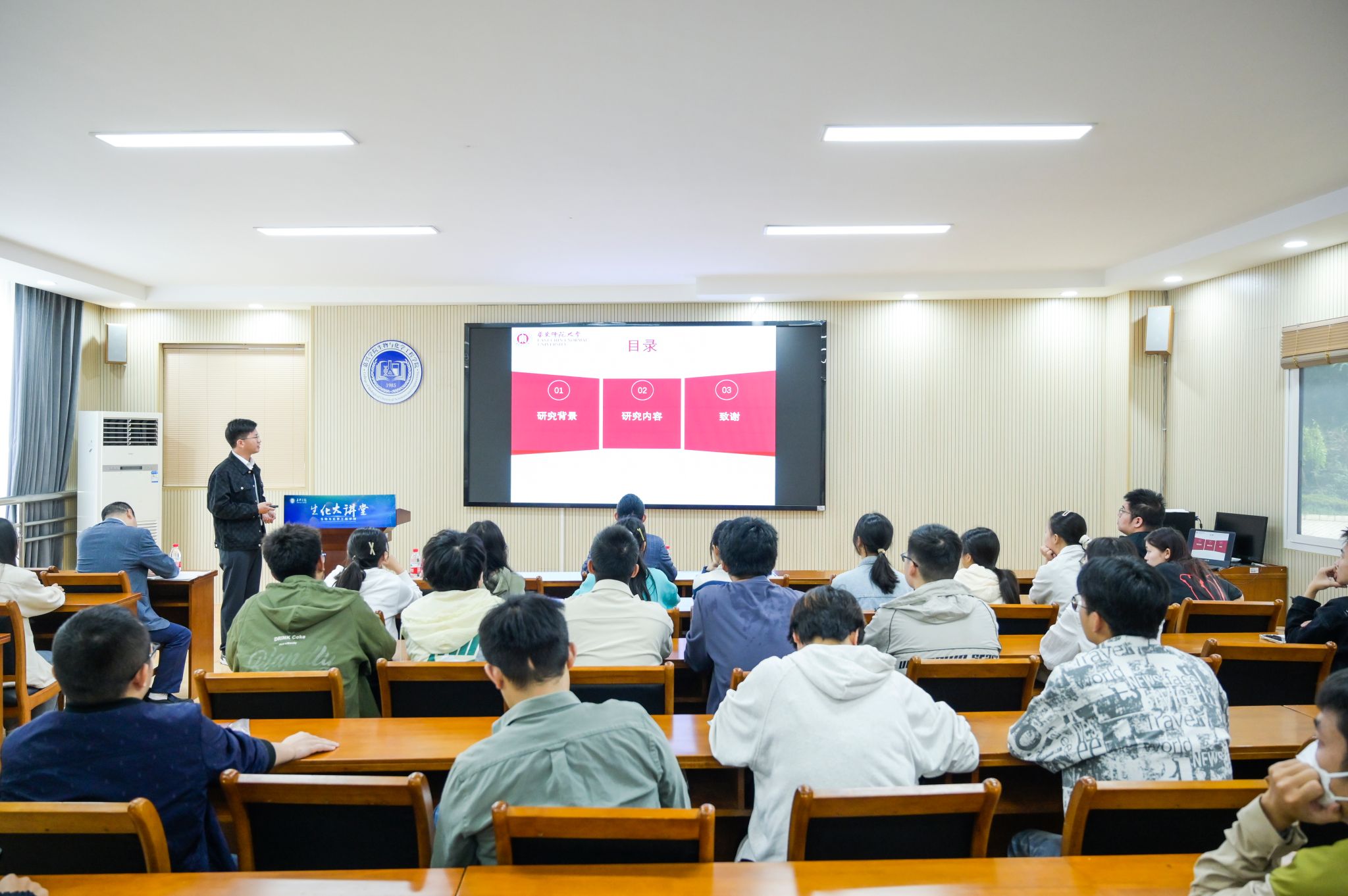 10月13日上午,公司举办“生化大讲堂”第二十三期学术交流会,本次大讲堂特邀请华东师范大学物理与电子科学公司博士、博士后魏发财作题为“新型介孔功能材料的制备和应用”的学术报告。会议由公司经理曹雪波教授主持,全院及中澳先进材料与制造研究院师生近40人到场聆听。