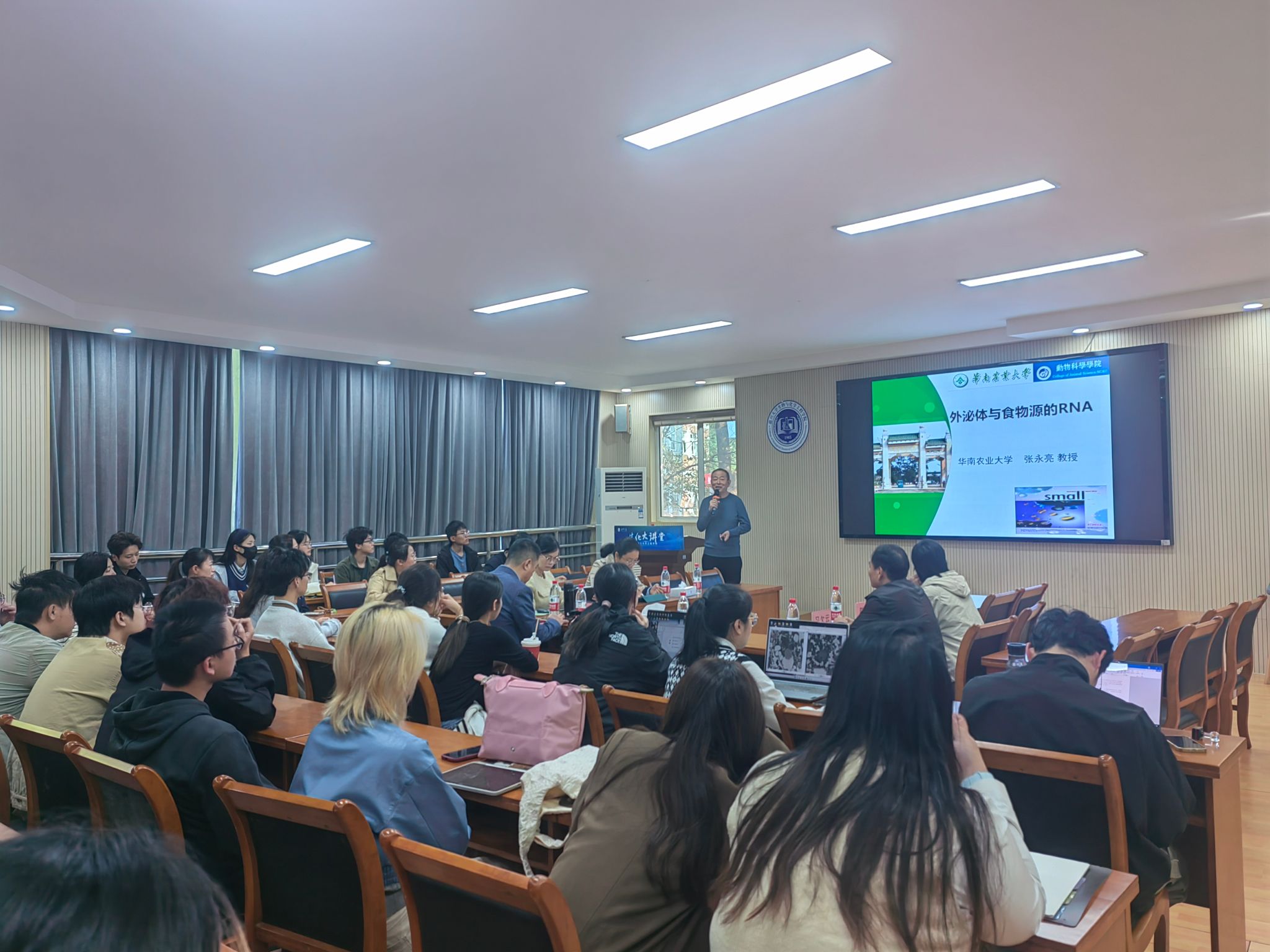 10月25日上午,华南农业大学张永亮教授作客“生化大讲堂”并应邀为永利65335com师生作题为“外泌体与食物源的RNA”的学术报告。图书馆副馆长张瑾教授主持会议,永利65335com师生近60人到场聆听。