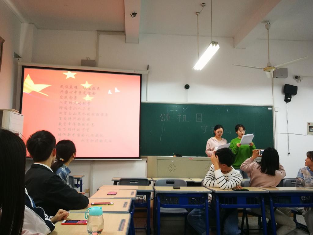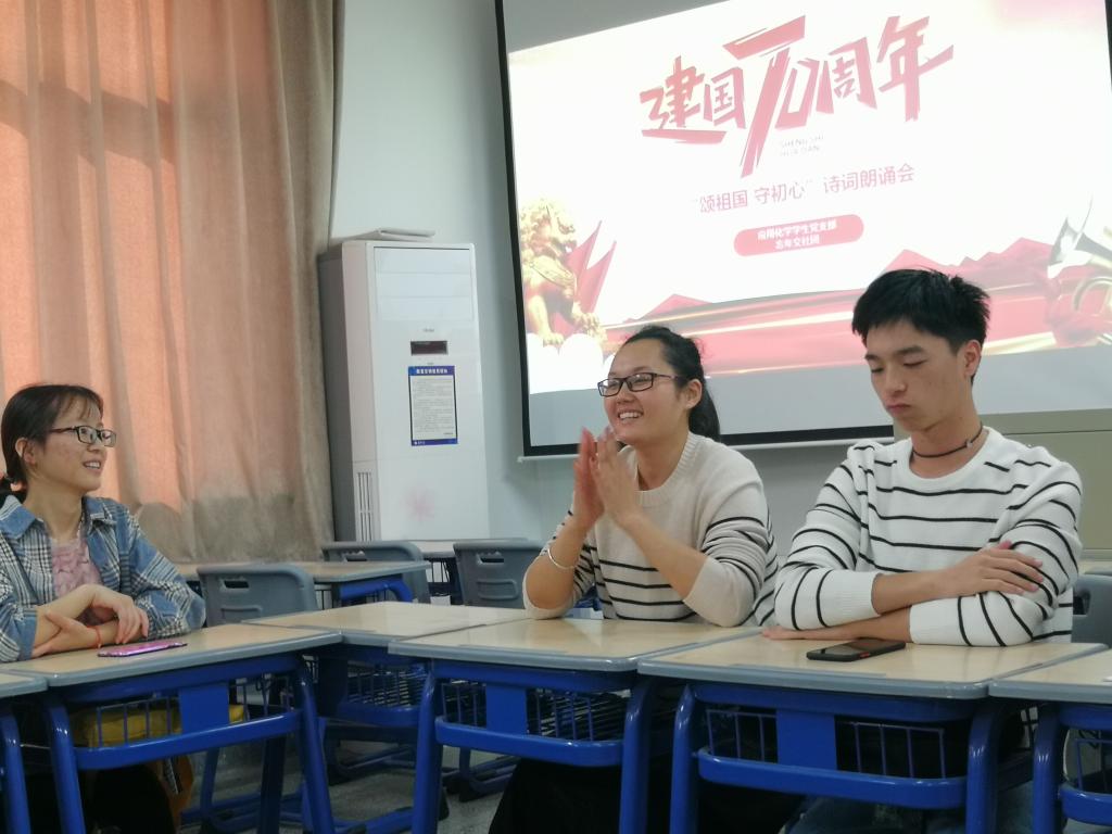 活动由员工党员代表柳依楠主持。首先是支部党员代表“颂祖国”的环节,“尽管多少次感到失意彷徨,但你总还是踏归途,重返家园,重返美丽,富饶,像采石场上的春天一样贫穷的祖国!”同学们深情朗读,言语中充满了对祖国发展的自豪。新四军历史研究会的文爷爷进行点评,并带领同学们回忆中国曾遭受的苦难,发展过程中的挫折等。最后,同学们向文爷爷请教生活或学习中遇到的问题,文爷爷以个人丰富的人生阅历,以身为老党员的所感所悟耐心解答。