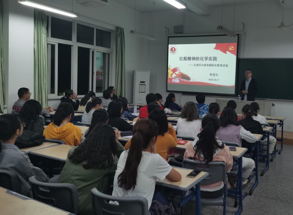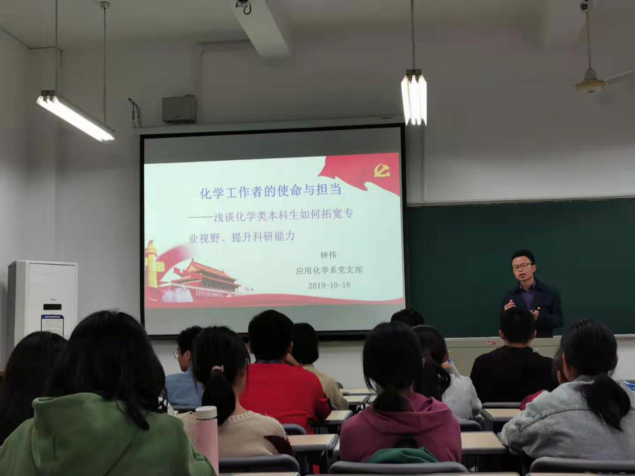 为深入学习习近平新时代中国特色社会主义思想,认真贯彻党中央“不忘初心、牢记使命”主题教育精神,10月17日、18日,应用化学系党支部结合应用化学(国际化)专业人才培养方案以及多位党员教师具有比较丰富的海外学习或工作经历的特点,精心组织了党员教师“党课进课堂”的主题活动,分别邀请了应用化学系教工党支部的朱连文和钟伟两位党员老师,给2018和2019级应用化学(国际化)专业的同学讲授两次主题党课。