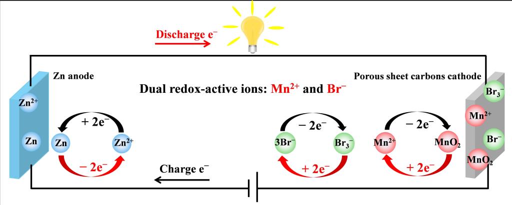 水系锌离子混合超级电容器是有竞争力、环保和安全的储能器件,但由于其比容量低,无法满足实际应用的需求。李溪教授团队通过在电解液中加入双氧化还原活性离子(Mn2+和Br−),其比容量是未添加氧化还原活性离子器件的2.66倍,达到1.25 mAh/cm2 (312.2 mAh/g)。机理如下:Mn2+被氧化为MnO2,沉积在正极多孔碳材料表面,Br−被氧化为Br2,同时与Br−结合形成Br3−,吸附在正极多孔碳材料孔道内,放电时发生相反的反应。得益于Mn2+ 和 Br−贡献的容量,器件的比容量得到显著的提高。该研究工作对新型水系锌离子储能器件的结构设计提供了新思路。