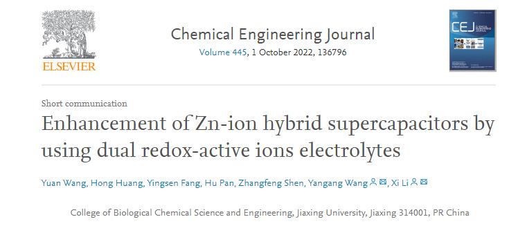 Yuan Wang, Hong Huang, Yingsen Fang, Hu Pan, Zhangfeng Shen, Yangang Wang* and Xi Li*,Enhancement of Zn-ion hybrid supercapacitors by using dual redox-active ions electrolytes, 2022, 445, 136796.