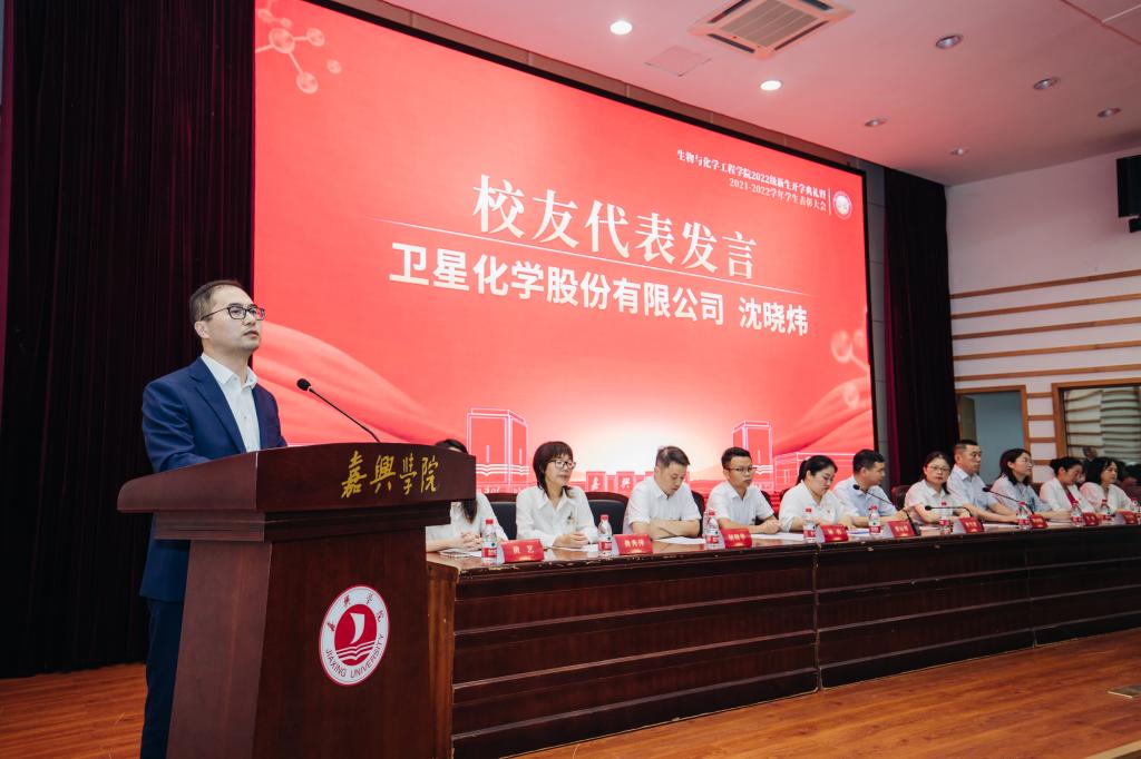 浙江卫星化学股份有限公司副总裁、公司2004届毕业生沈晓玮作为优秀员工代表进行发言。他分享了毕业十八年来自己从老员工到上市公司高级职业经理人的成长故事,强调指出坚持不懈的学习是人生成功必备的条件。他鼓励同学们要敢于吃苦、甘于奉献,尤其是站在人生发展的新起点,要注重学有所长,打好基础;还要注重兼收并蓄,提升能力;更要注重知行合一,加强实践。