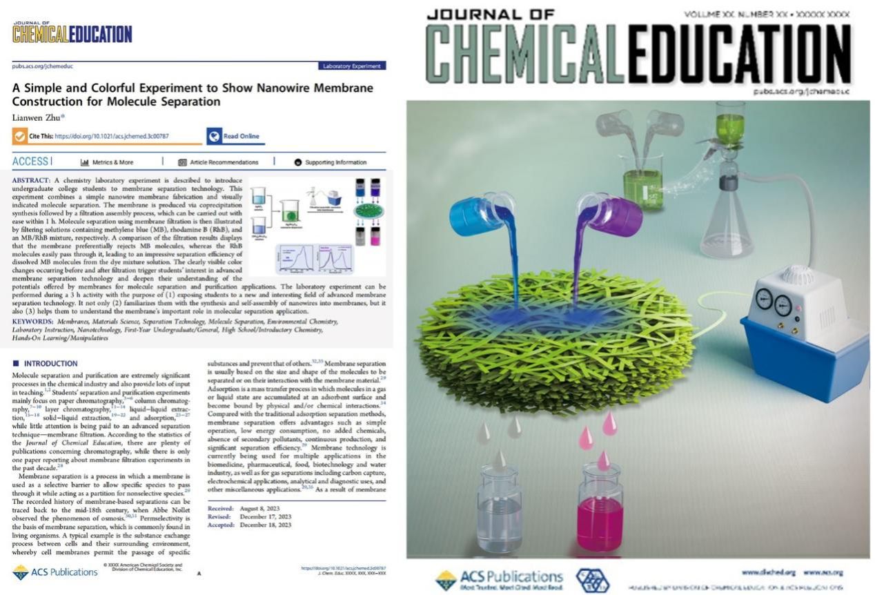近日,美国化学会旗下化学教育国际顶级期刊《Journal of Chemical Education》发表了公司永利65335com朱连文副教授的教学研究成果“A Simple and Colorful Experiment to Show Nanowire Membrane Construction for Molecule Separation”(论文链接:https://pubs.acs.org/doi/10.1021/acs.jchemed.3c00787),成果受到审稿人高度评价“I look forward to seeing this article in print. Fantastic job”,并被遴选为当期内封面文章。这是公司首次在该期刊发表教育研究论文,实现了公司化学教育类教研论文在国际教育类顶级期刊零的突破。