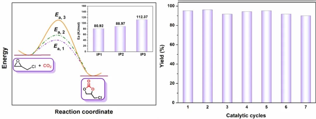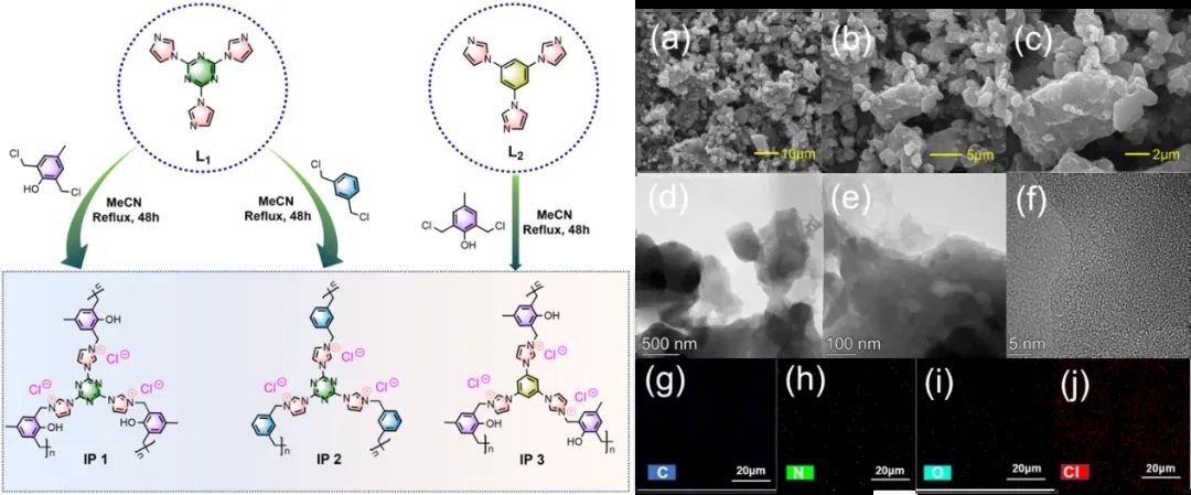 离子聚合物(IPs)因其具有丰富的孔隙度、固有的活性离子位点和保留离子液体性质的特性,被认为是CO2环加反应中最有前途的催化剂。尽管已有不少离子聚合物应用于催化二氧化碳环加成反应的报道,但这些催化剂大都需要在较高的反应温度或较大的CO2压力条件下才能实现高效转化,不利于其进一步工业生产应用。因此,如何通过催化剂的合理设计,将多个催化活性关键组分引入,以实现常温、常压条件下的高效CO2环加成反应,仍然是该研究领域的一个挑战性工作。