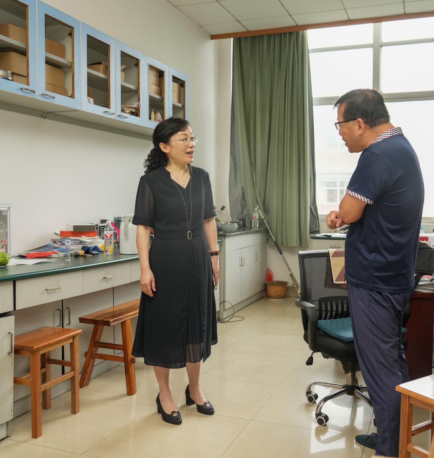 在明礼楼实验室,张琦与师生进行了亲切地交谈,询问大家暑期的工作和学习情况,叮嘱大家做好防暑降温和安全防护工作,注重劳逸结合。她还就暑假期间进行的各类学科类竞赛相关工作表示了关切。