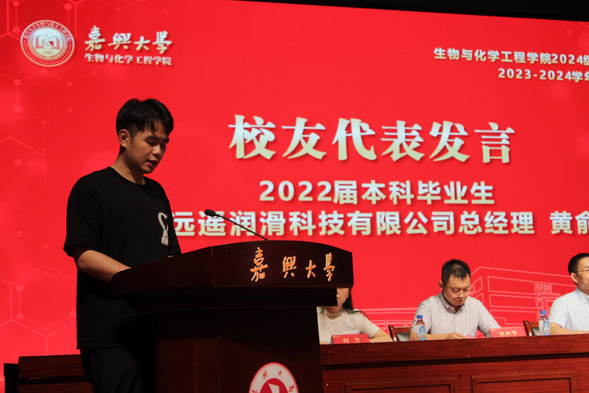 2022届化工专业员工、浙江远遥润滑科技有限公司总经理黄俞杰作为员工代表发言。他回顾了自己在母校的求学之路,以亲身经历告诉同学们,要尽早确立目标、尽力完善自我、保持身心健康、享受老员工活。