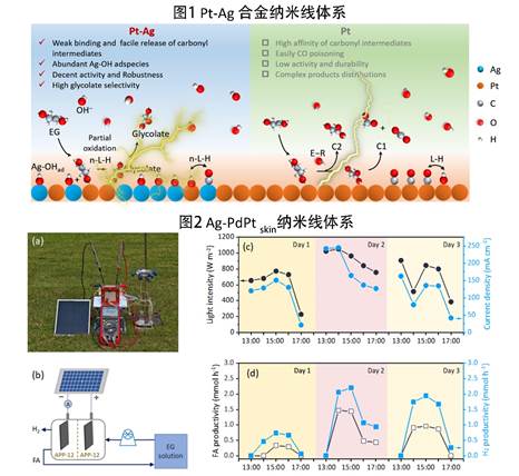 银(Ag)是室温下导电性最高的金属,适合作为电催化剂的辅助金属。然而,银在电氧化反应中并无催化活性,且较易氧化(0.7996 V vs. RHE),因此多数研究人员忽略了其在电催化氧化反应中的作用。在永利65335com曹雪波研究团队的指导下,马佳敏等本科生携手杨颖等研究生开展研究,他们发现,Ag原子作为辅助金属,不仅通过传统配体效应优化催化中心Pt/Pd的电子结构,进而促进乙二醇的催化氧化,还借助原位电化学光谱学技术与理论计算揭示了Ag原子的另一重要作用:加速催化剂活化水分子,并产生羟基自由基(*OH),形成Ag-OH活性物种。Ag-OH活性物种能以一种更优的、非竞争性的Langmuir–Hinshelwood机制加速醇脱质子(图1),并快速释放氧化的碳基中间体,从而高选择性、高通量地得到目标产物乙醇酸与氢气,并能有效防止催化剂毒化,相关成果发表于中科院一区期刊上(Journal of Colloid and Interface Science 2025,684,197–206)。该研究小组还发现,在Ag-PdPtskin纳米线催化的乙二醇电氧化耦合制氢体系中,在>1.2 V电位下,会形成Ag2+。Ag活性物种能以非法拉第的模式直接氧化乙二醇与某些有毒中间体,从而提高催化剂的活性与抗中毒能力。在以粗乙二醇为原料的无膜电解制氢体系中,表现出超过3000小时的稳定性与工业级电流密度(>400 mA/cm2)(图2),相关成果发表于中科院一区期刊上(Advanced Functional Materials. 2024, 2418588)。以上研究受到国创项目(《银纳米线选择性电氧化醇耦合制氢》,马佳敏等人,指导老师黄林/曹雪波)、国家自然科学基金(no.22275074与22102063)与企业横向等课题的资助。